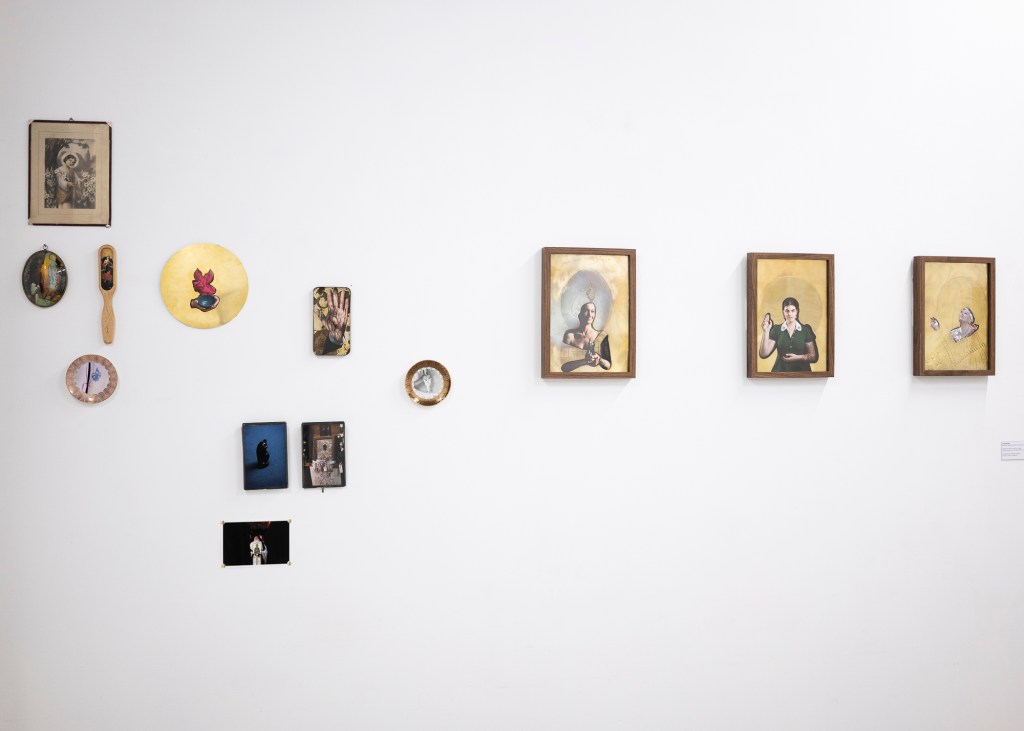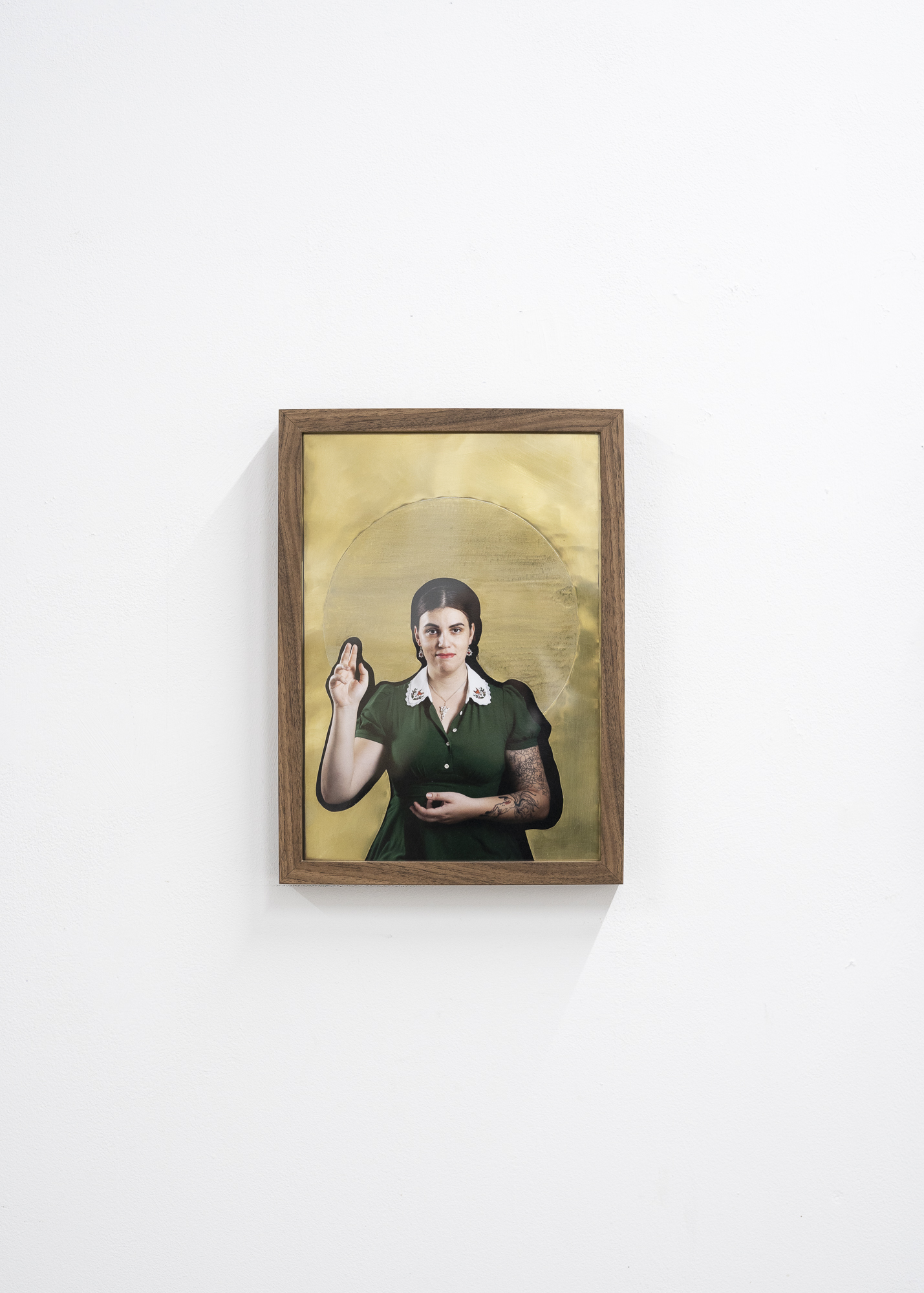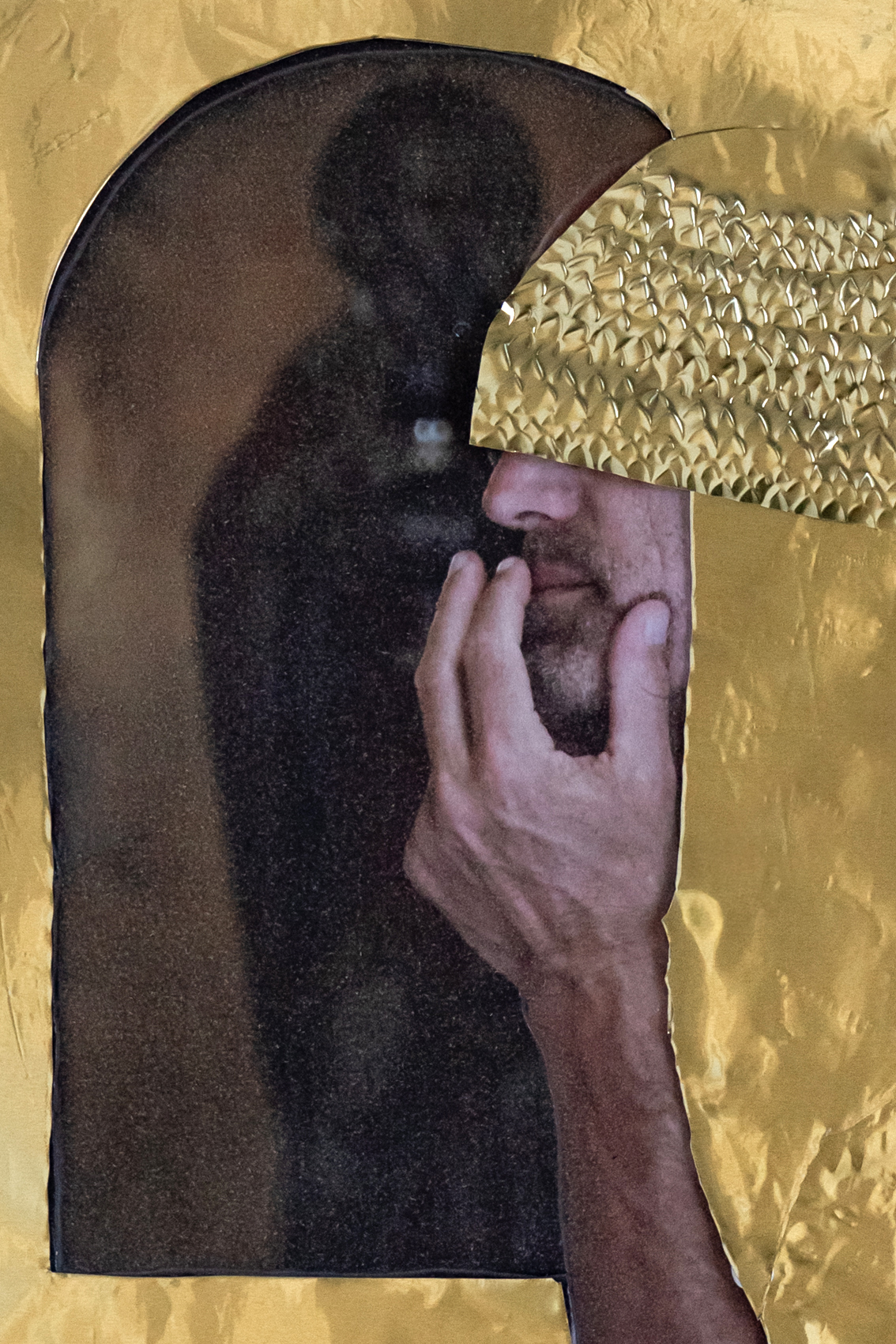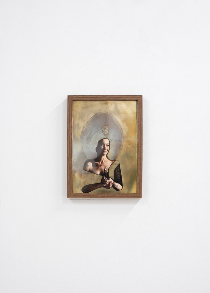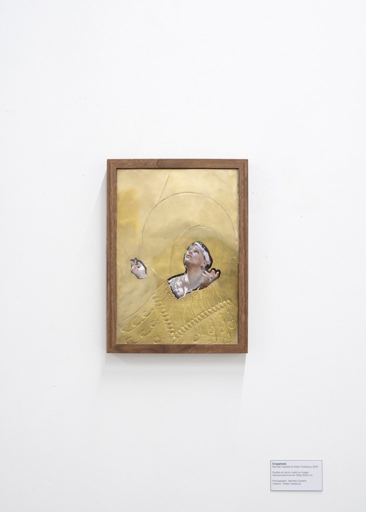 Dans le projet Croyances, la photographie rencontre le travail du laiton, une matière choisie pour faire ressortir la sensualité propre aux objets. Avec une pointe de provocation, je me suis inspirée de la tradition des icônes byzantines, souvent multicolores et rehaussées d’or, où le sacré s’invite dans les scènes de la vie quotidienne. Grâce à cette technique, je place les personnes que je photographie en icônes, avec l’intention de les dissimuler derrière l’artefact, afin de tracer leur part de mystère.